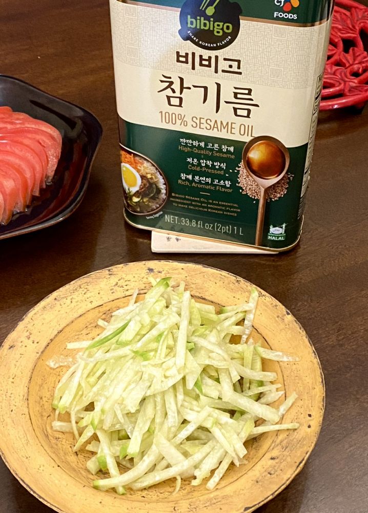 等发面的时候,准备俩凉菜,凉拌青萝卜,用盐,糖,酿造白醋,香油。这个costco买的韩国香油,便宜。