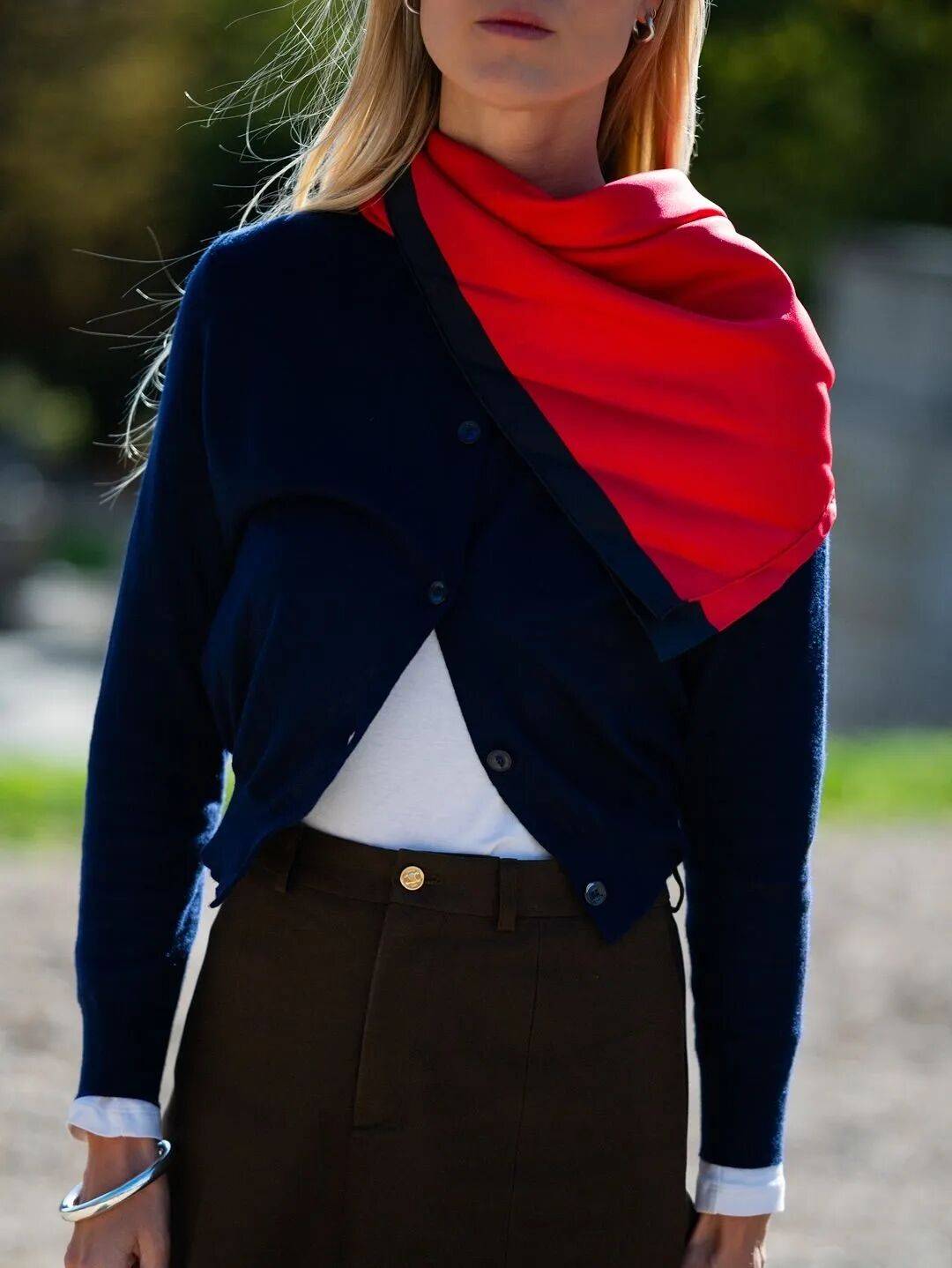 又若全身是低饱和的中性色,一件亮色系针织系在腰间,会让造型更轻盈。