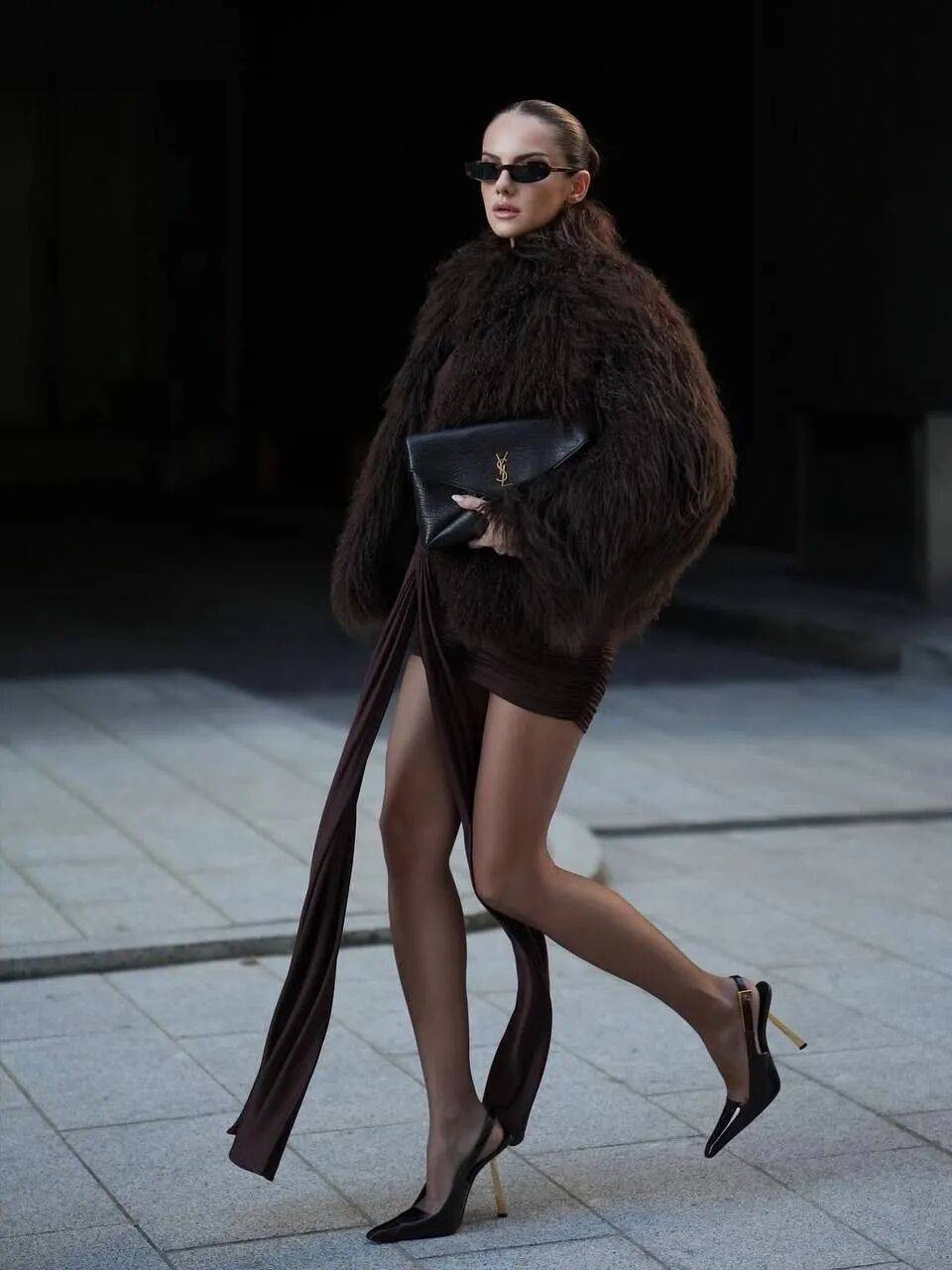 下半身可选择直筒裤或打底袜,让皮草的体积感和身体线条形成清晰对照。