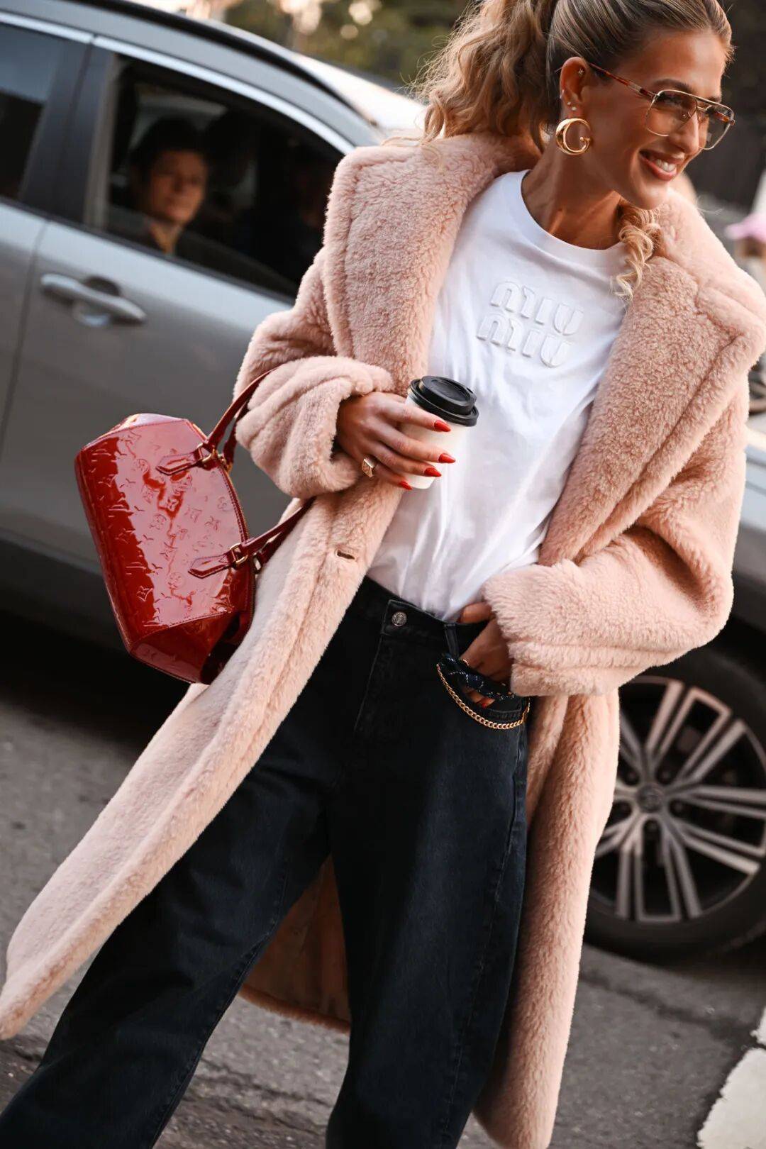 羊羔毛外套的毛绒感比皮草更平和,触感舒适,带着一种自然的亲和力。