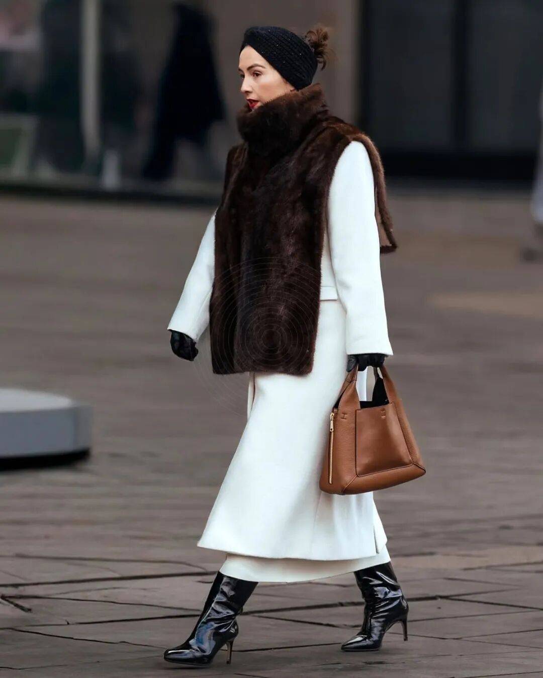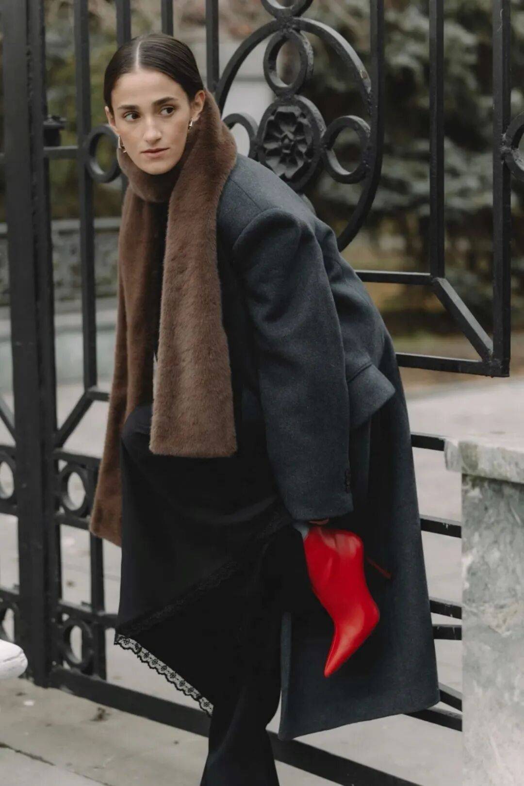 皮草马甲则是叠穿的利器。套在同色系西装外套外,会让结构化的线条变得柔和,也更具层次。