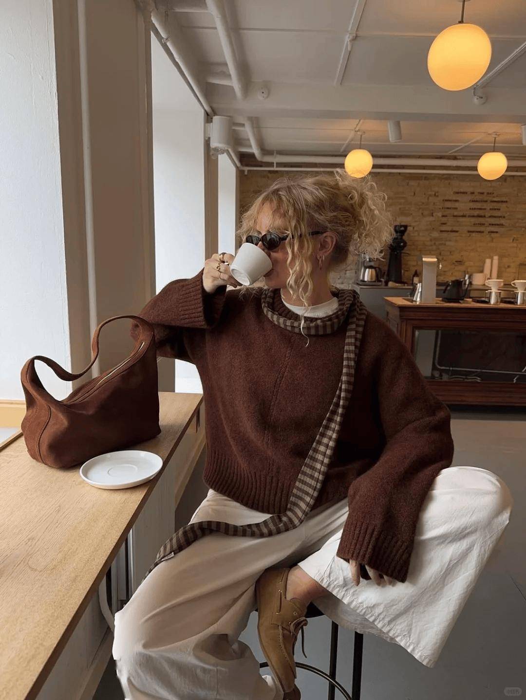 粗针织的棕色毛衣,搭配米色阔腿裤,配一条棕色条纹细围巾,营造出一种舒适又随性的氛围。