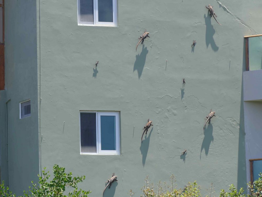 一路延绵的白色沙滩和礁石上常见海蜥蜴( Marine iguanas)的身影。它们是 Galapagos 独有的蜥蜴,每个岛上种类不同,颜色可随季节变化。海蜥蜴吃海藻,绿海藻或红海藻,潜水觅食,可下潜至30米。从冷水中上来后,它们就在阳光下晒太阳取暖,黑黢黢的皮肤有助于吸收热量。这些样貌丑陋的黑金刚在这里真是随处可见。