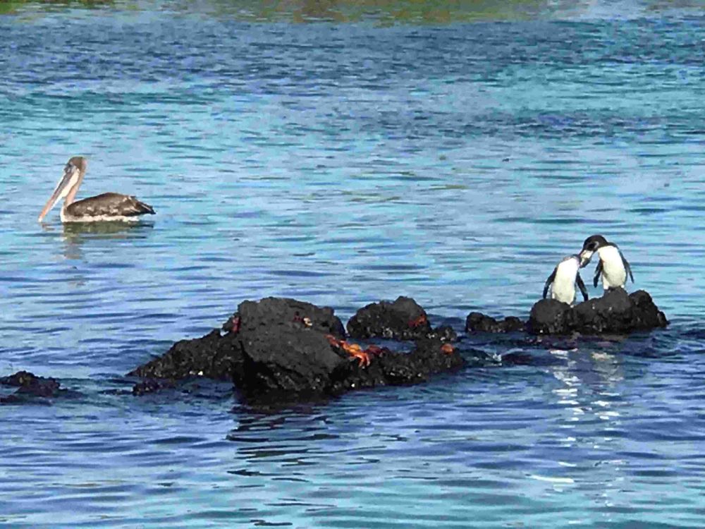 你会奇怪怎么在赤道附近会看见企鹅?它们不是生活在寒冷的南极大陆吗?Galápagos penguins是本土企鹅,因为这里有寒冷的洋流可提供给它们生存的环境条件,它们个头儿矮小,尖嘴短鳍,身高不到半米,远看上去就像礁石上伫立着可爱的小木偶一般。