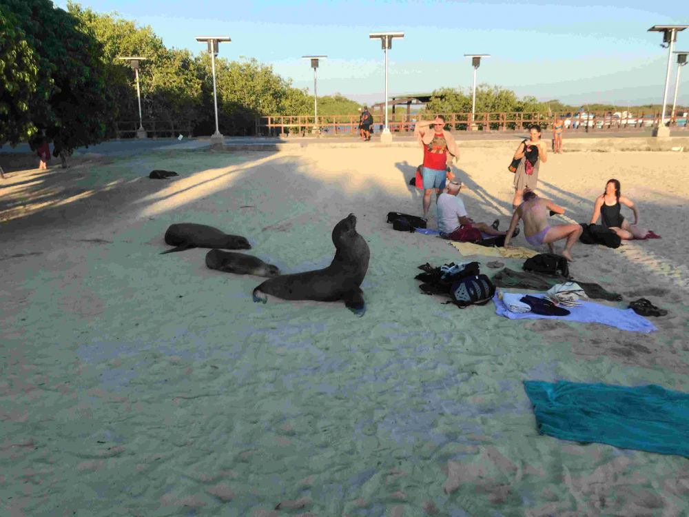 黄昏时,上岸的海狮就躺在沙滩上给游人休息的椅子上,甚至抢占游客在沙滩上休息的地盘。这里的海狮喜欢跟人互动。
