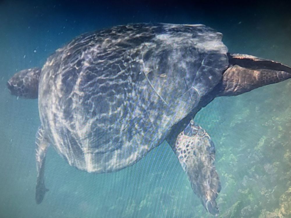 一下水就发现了海龟。巨大的海龟在啃噬水下礁石上的水草,在我的下方缓缓滑过。我几乎触手可及它那凸起的背壳,透过清澈的海水,清晰可见上面的花纹和它头上的一对小眼睛。
