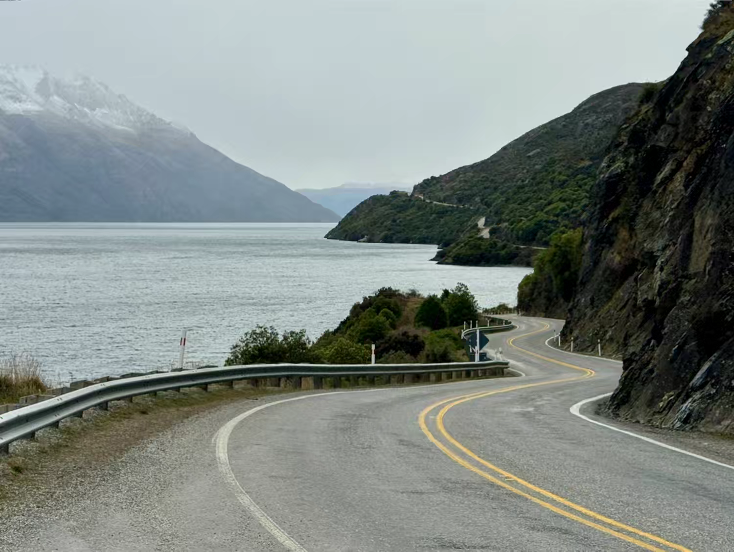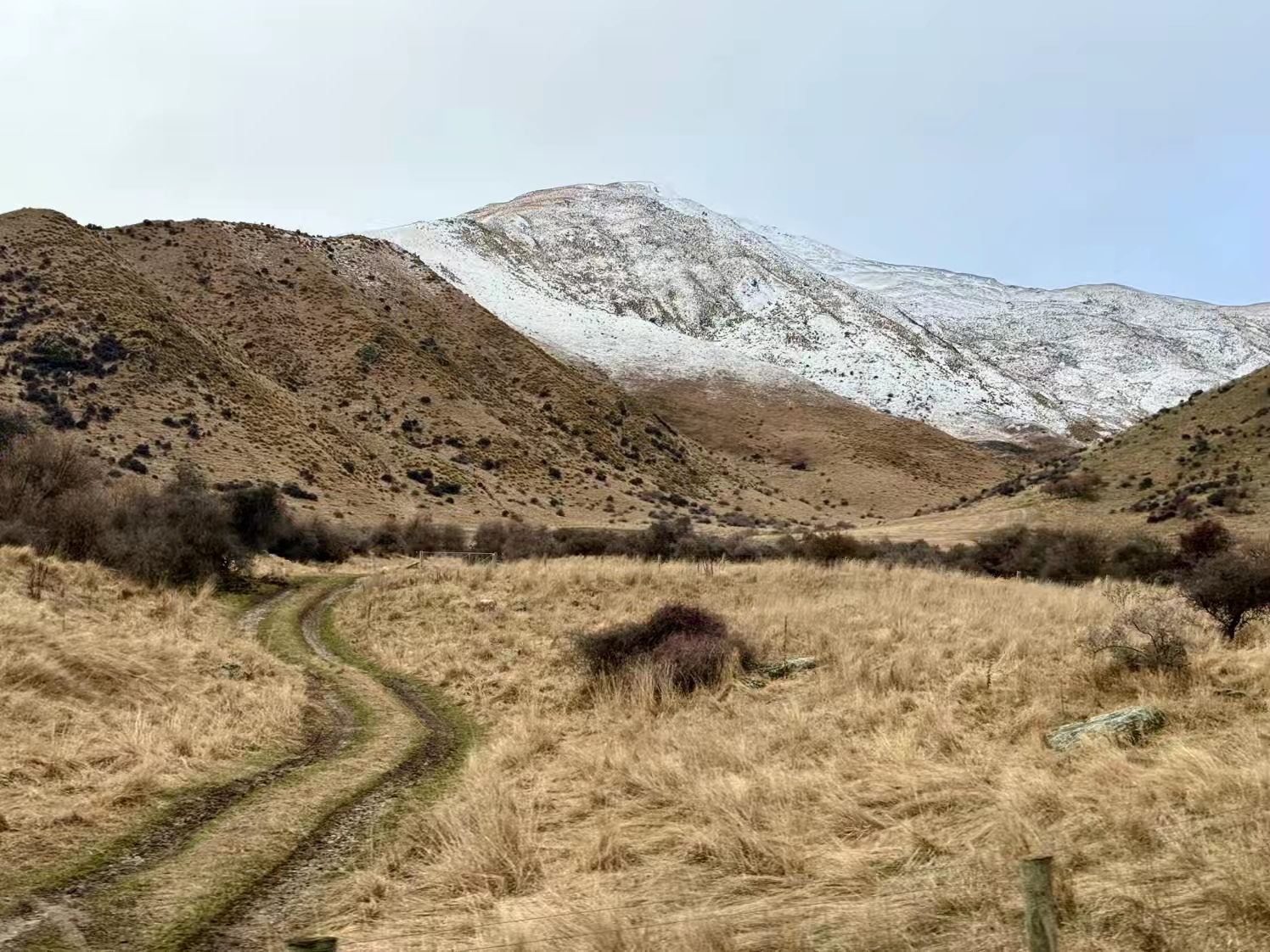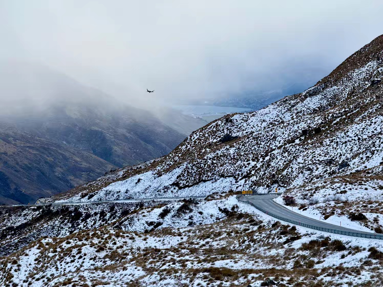 离开箭镇后,我们继续往瓦纳卡方向前进,沿着著名的 Crown Range Road(皇冠山路) 翻越山口。这里是全新西兰海拔最高的公路垭口,盘山公路陡峭蜿蜒,越往上走,视野越开阔。那天山顶不仅飘着雪,狂风更是大得惊人,几乎把人吹得站不稳,这大概是我们在新西兰遇到的最大的风速了,跟巴塔哥尼亚百内国家公园的狂风都有得一拼…