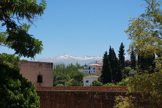 图01.雪山下的格拉纳达-从阿尔罕布拉遥望西班牙内华达山脉(SierraNevada)的雪峰,最高峰海拔为3479米。