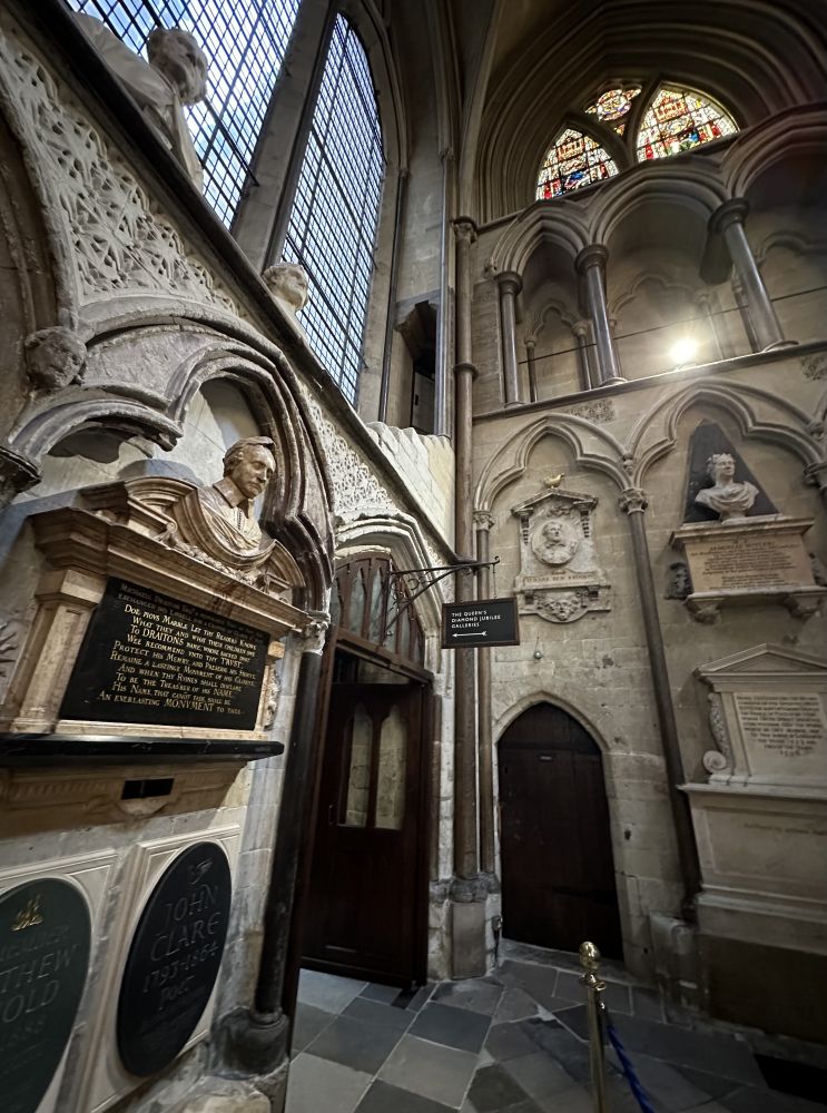 我们从亨利七世小礼拜堂走到南侧耳堂,这里是许多包括狄更斯在内的英国文学巨匠们的安息地,所以被称为“诗人角”,有些著名的作家和艺术家比如莎士比亚和简奥斯汀没有被葬在此处,但是他们的雕像和名字也被纪念在“诗人角”以表彰他们对英国文学的卓越贡献。