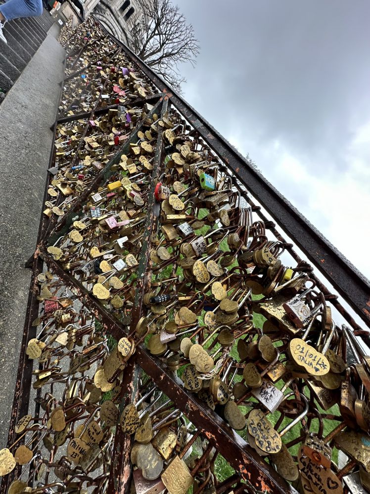 圣心圣殿(Sacre-CoeurBasilica)建于巴黎的最高点Montmartre山丘上,汽车只能在山脚下行驶,所以我们不得不顶着风顶着雨往上坡前进。当我们到达通往圣殿石梯的底部,我就被两旁扶手上挂满的同心锁给震撼到了,那么多的情侣到这个圣心殿来表达对彼此的爱意,我相信每对伴侣在挂上他们的同心锁的那一刻都满怀着永不变心一生守候的信念,不知道在现实中有多少对还在一起。[