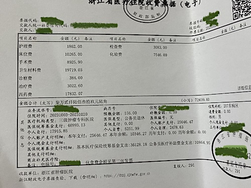 文城有网友回国探亲的时候, 晒过一张中国南方某医院的账单。其家人动手术,住院18天, 从账单上看共花费近 7万3千元。 经过医保后,个人只出2479 元。