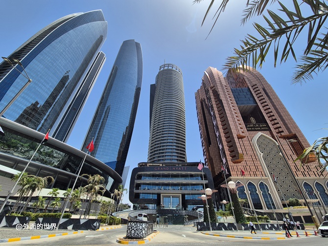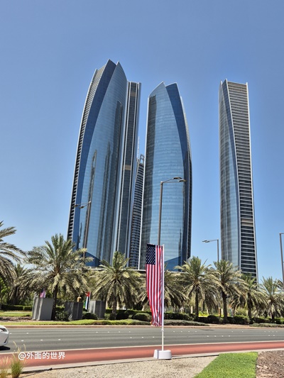 Etihad Towers 塔楼坐落在阿布扎比海滨大道(Corniche Road)上,“360° 全景玻璃窗,最佳观景地。