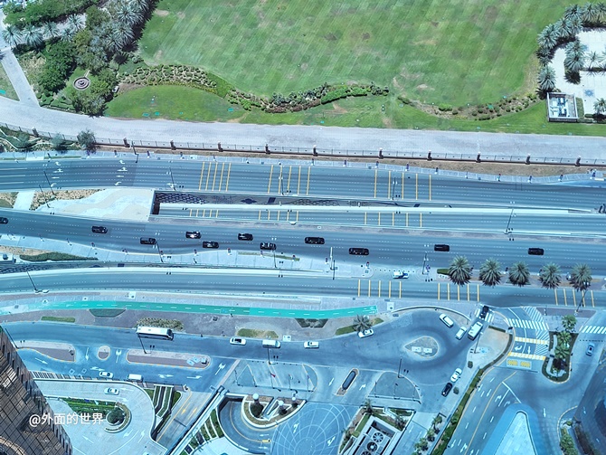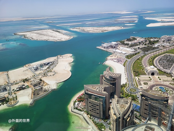 从观景台往外看,可以俯瞰阿布扎比市区天际线、Corniche 海滨大道、阿拉伯海湾 (Arabian Gulf),视野非常开阔。无论是城市、海湾、沙滩、岛屿都可以尽收眼底。