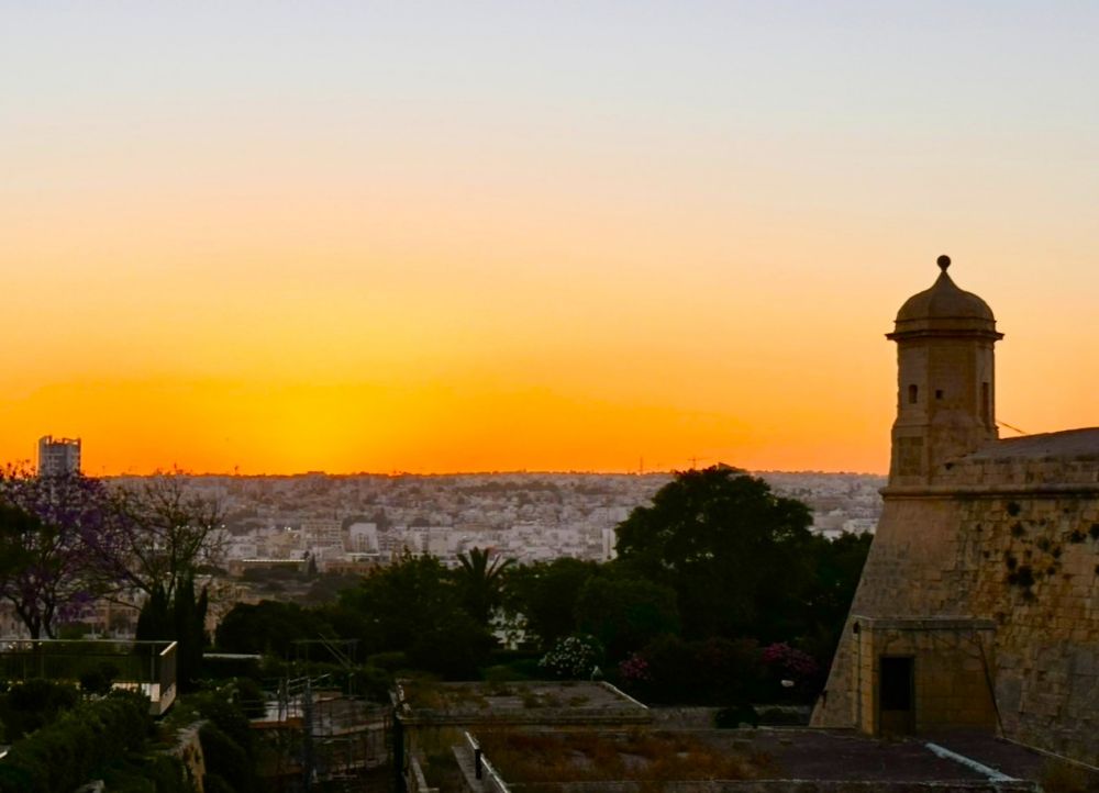 瓦莱塔的古城堡伸入湛蓝的地中海,在夕阳下泛着金光。