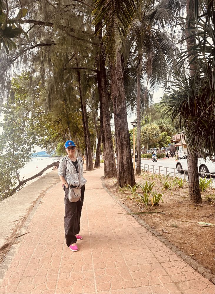 据说Ao Nang是甲米最著名的海滩之一,怪不得,一下车门不但感觉到阵阵海风的温度,也感受到在一个旅游热点处处是人浪的热度。川流不息的人流不由得让我把老妈的手臂挽得更紧了。老公一看到沙滩,心就飞翔起来了,见我俩对街道两边的商店更感兴趣,于是他也顾不得还是我妈的御用道路清障志愿者,手一指不远处的沙滩,美其名曰地说:我先去沙滩那里先行打探一下,看看老妈适不宜适宜去那里走走。我怎么会不知道他的小心思,他就是急着要去沙滩吹吹海风,趟趟海水。于是我们约定一个小时后在前方一排石凳处汇合,我就先陪着老妈去逛逛商店。