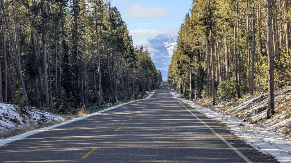 南边的松树高大而密实,阳光透不进来,路边的雪还未融化,满眼都是北国的景象。奇怪的是,在北门那边却没有这样的感觉。车外温度从45华氏度一路降到28度,仿佛驶进了另一个季节。这个时节来黄石,也许有点晚,但我却非常欣赏眼前的季节交替之美。