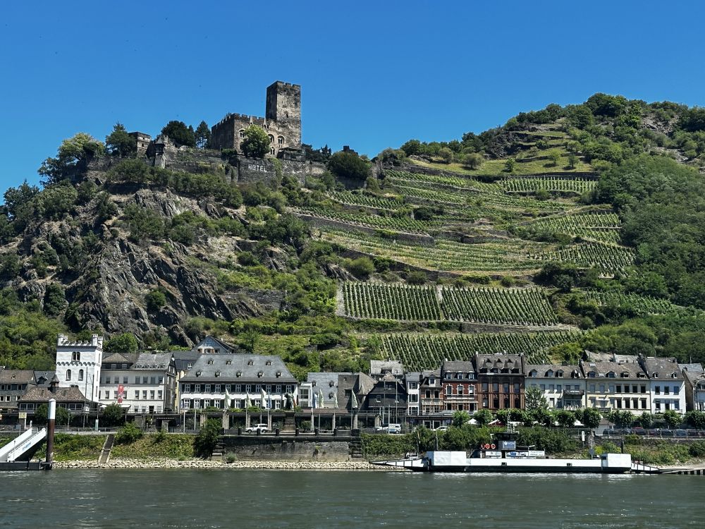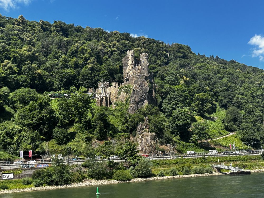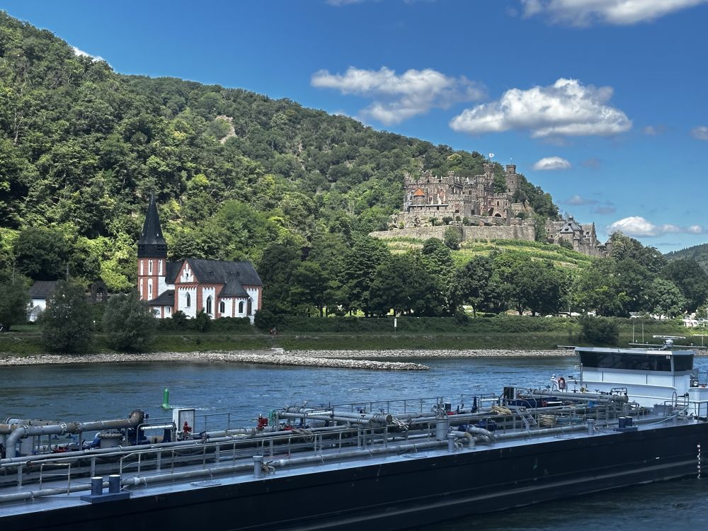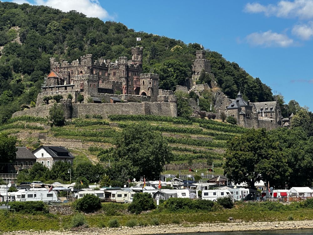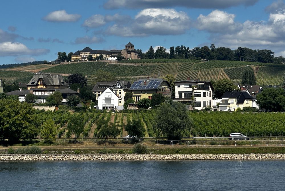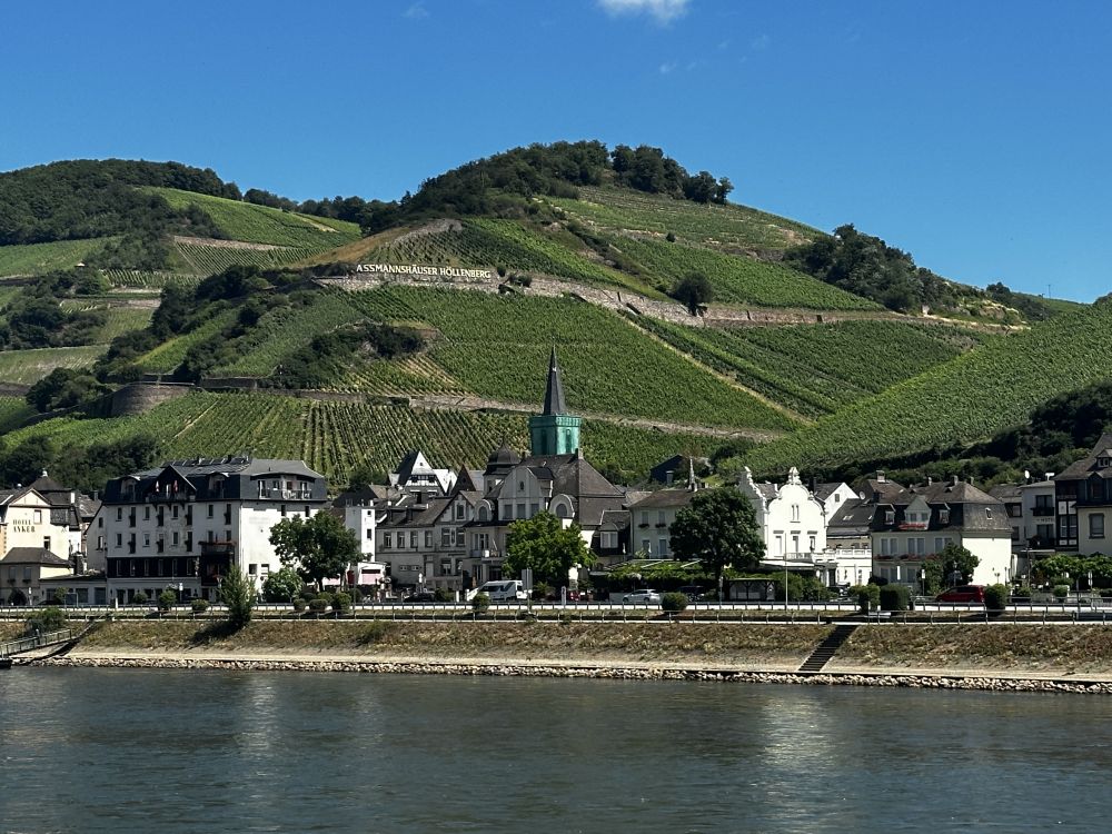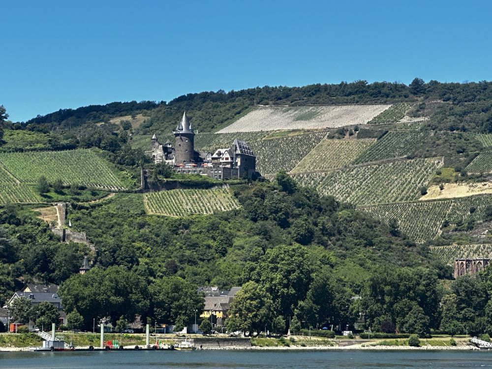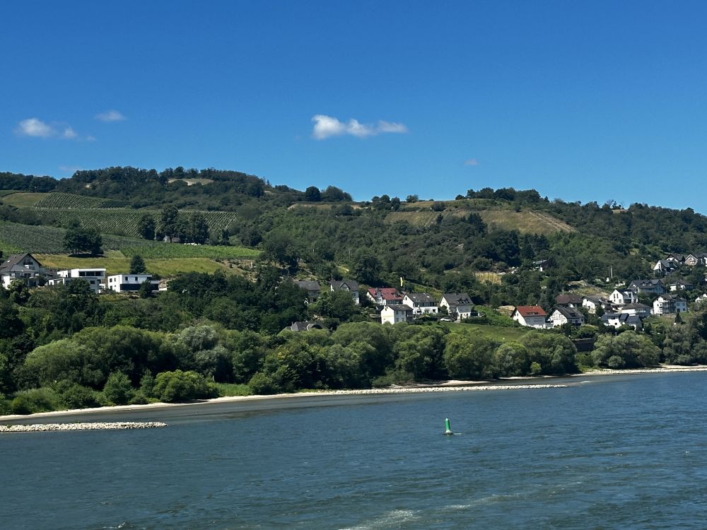 1. 上午,游轮缓缓驶过莱茵河的中段。河两岸散落着古朴的小镇和静谧的村庄,满山的葡萄园在阳光下泛着绿意,古堡与教堂错落其间,构成一幅迷人的河谷风光。