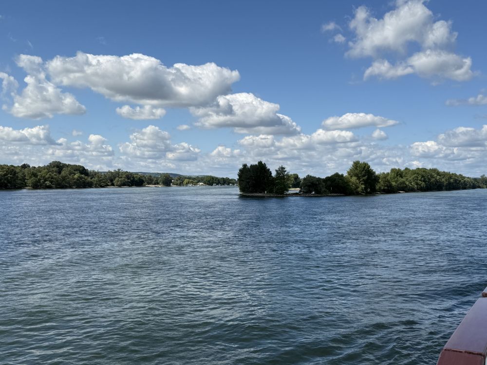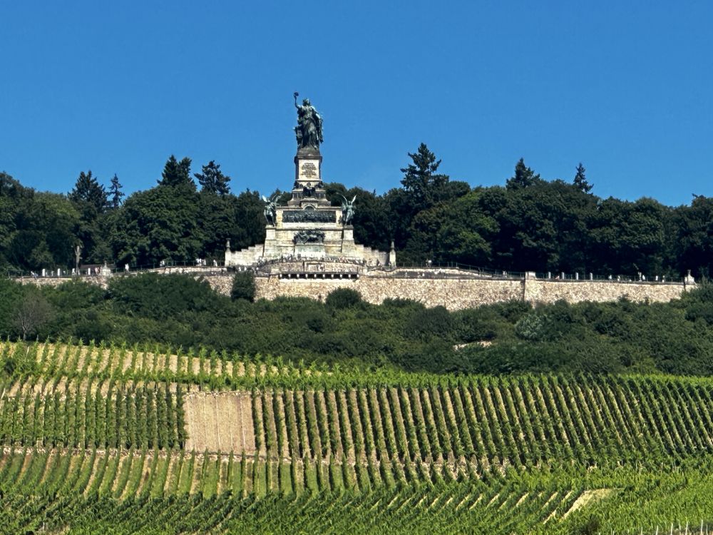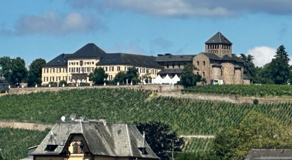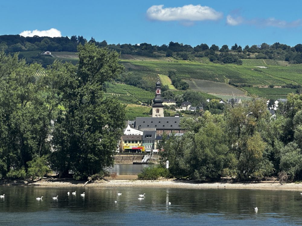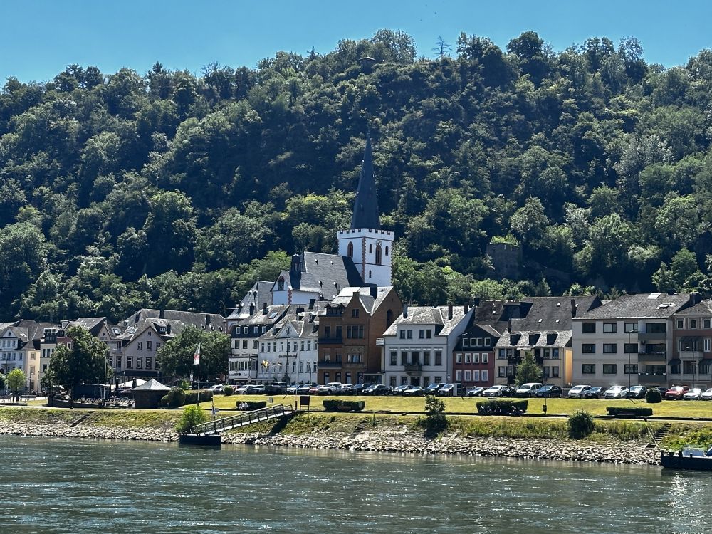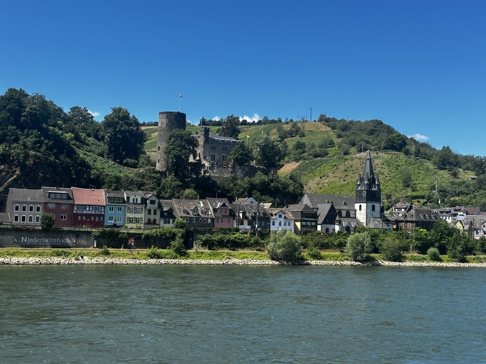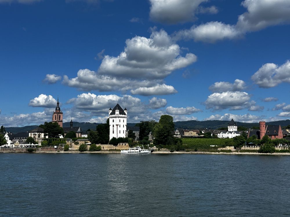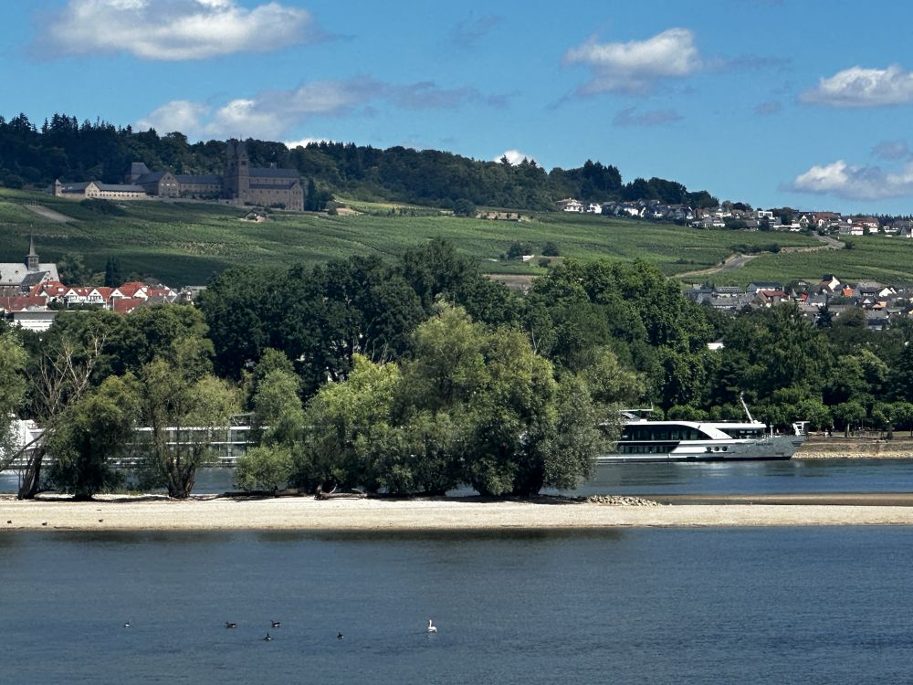 1. 上午,游轮缓缓驶过莱茵河的中段。河两岸散落着古朴的小镇和静谧的村庄,满山的葡萄园在阳光下泛着绿意,古堡与教堂错落其间,构成一幅迷人的河谷风光。