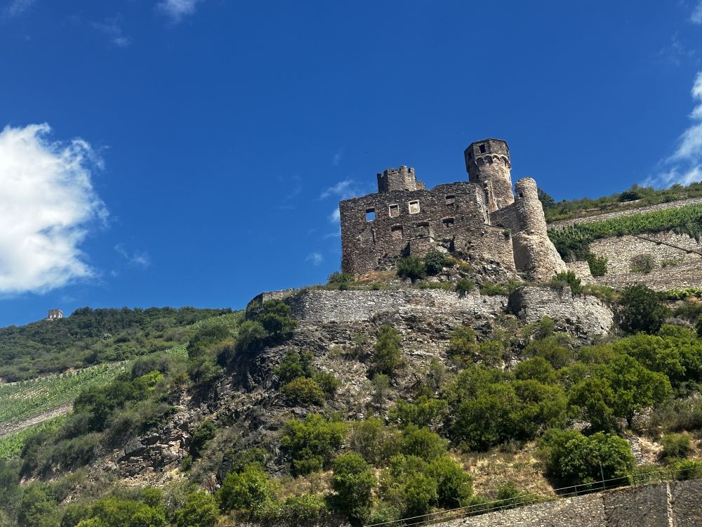在莱茵河对岸的山顶上,耸立着一座古堡,俯瞰河谷和周围的村落。