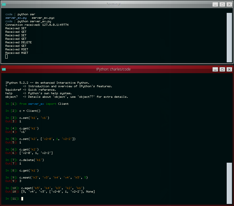 To test the server, just execute the server's Python module from the command line. In another terminal, open up a Python interpreter and import the Client class from the server's module. Instantiating the client will open a connection and you can start running commands!