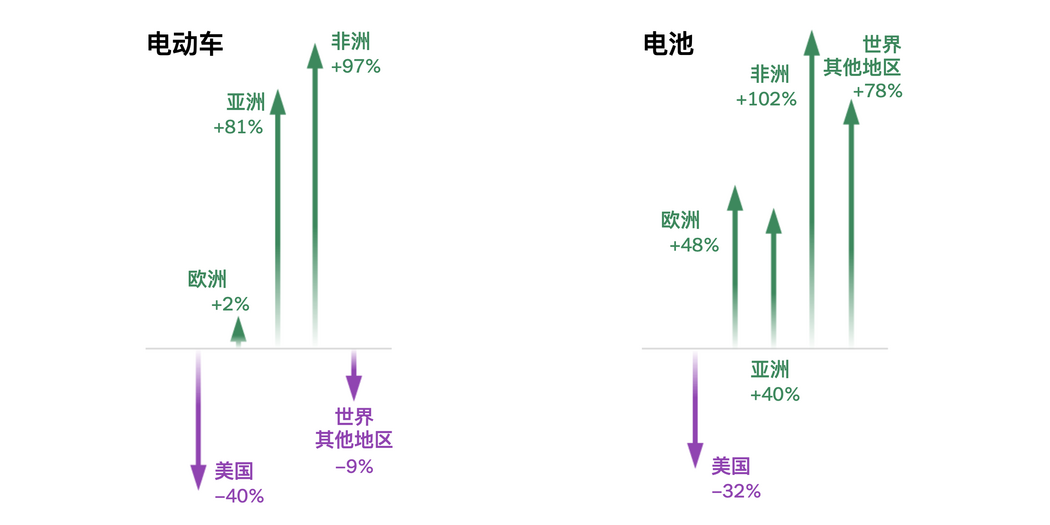与此同时,中国正向非洲(增长42%)和南美洲(增长13%)等发展中经济体大量出口汽车、卡车、自行车和船舶;通过出口电池和钢铁产品,中国在欧洲(增长7%)和亚洲(增长14%)的市场份额也在不断扩大。