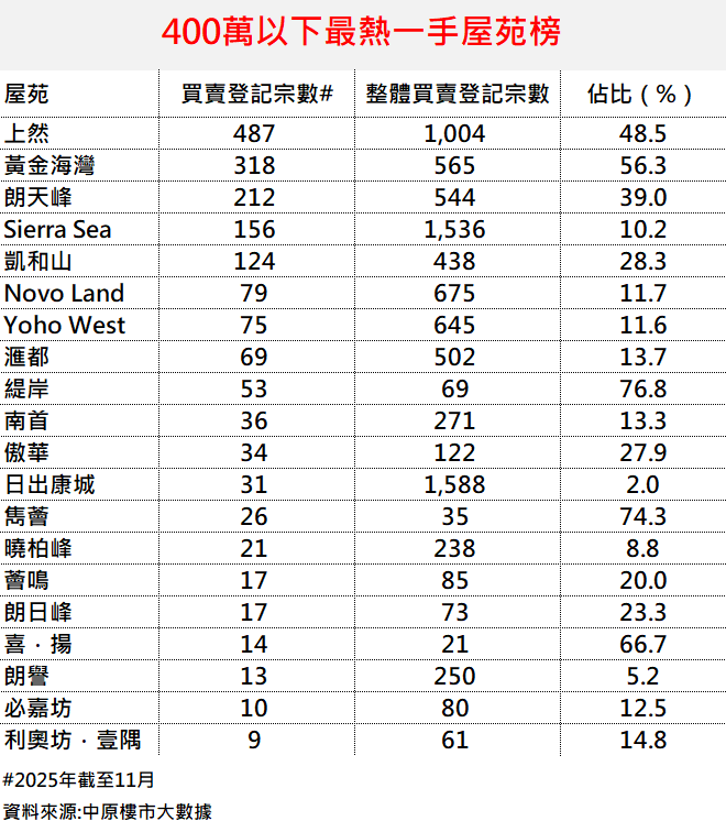 大埔上然以487宗成為400萬元以下成交最多的新盤,其後為屯門黃金海灣318宗、元朗朗天峰212宗,以及西沙Sierra Sea的156宗。