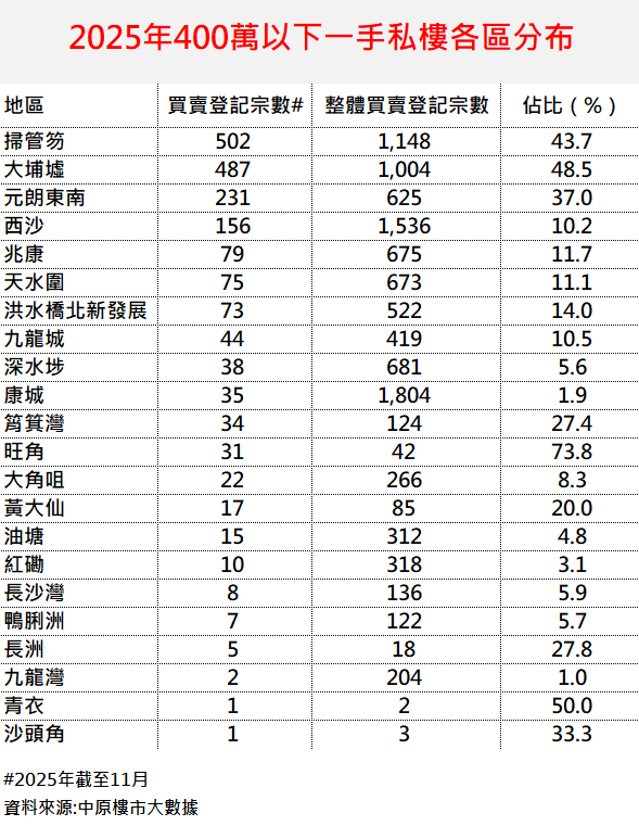 按地區分布,一手細價樓以掃管笏最旺,錄得502宗,其後是大埔墟487宗及元朗東南231宗;二手則以深水埗領先全港,錄556宗,其次為元朗市中心429宗及土瓜灣426宗。