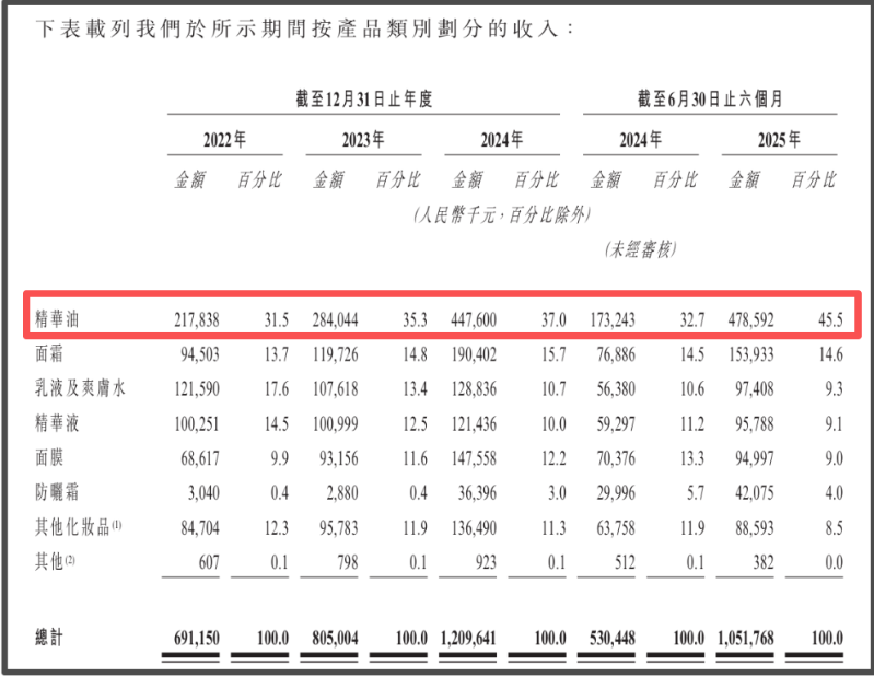 更值得深思的是大单品战略。截至2025年6月30日,林清轩提供230个SKU,广泛涵盖精华油、面霜、爽肤水、乳液、精华液、面膜及防晒霜等。但山茶花精华油系列贡献了近半的收入,“一油定乾坤”的格局虽带来靠山,但也意味着林清轩抗风险能力的降低。