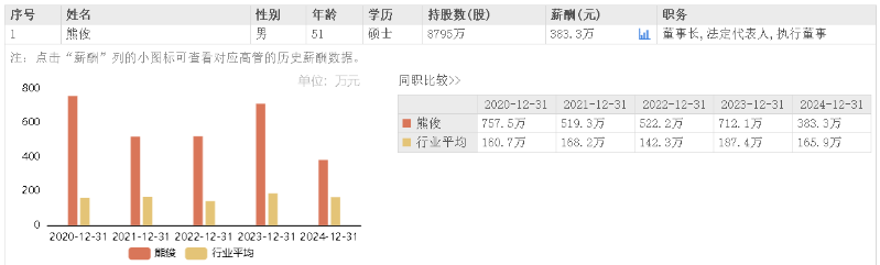 据东方财富网数据,熊俊2024年所获薪酬为383.3万元,相较上年薪酬712.1万元降薪46.17%。