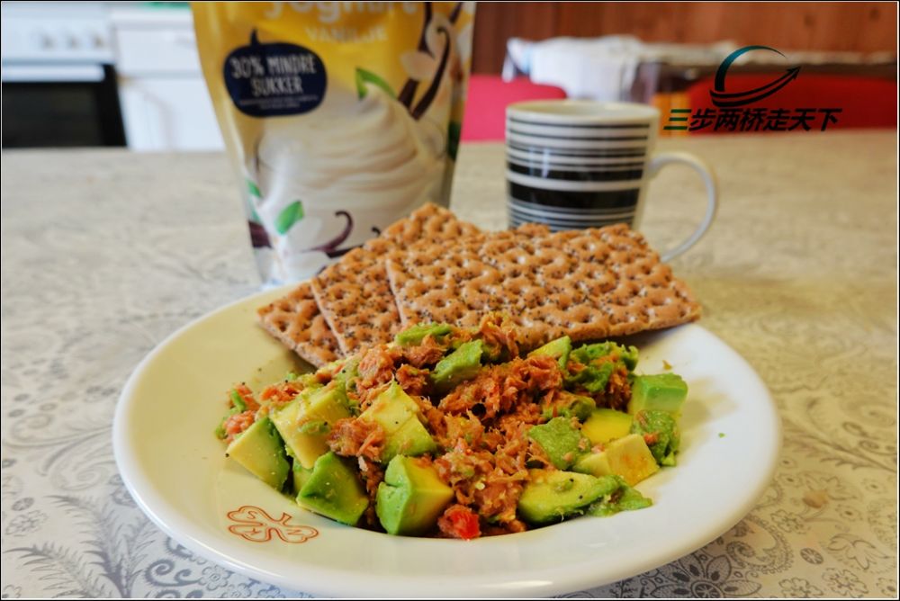 今天的早餐:泰式吞拿鱼拌牛油果配粗麦脆饼 + 挪威酸奶。