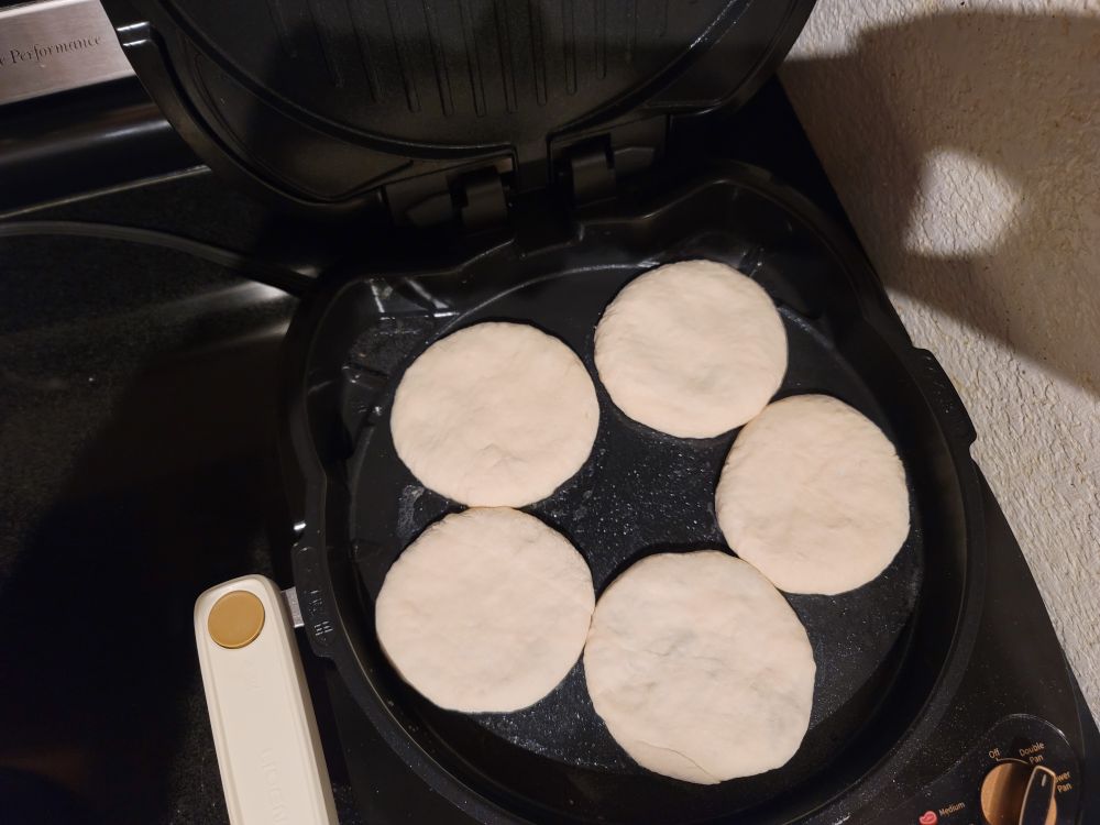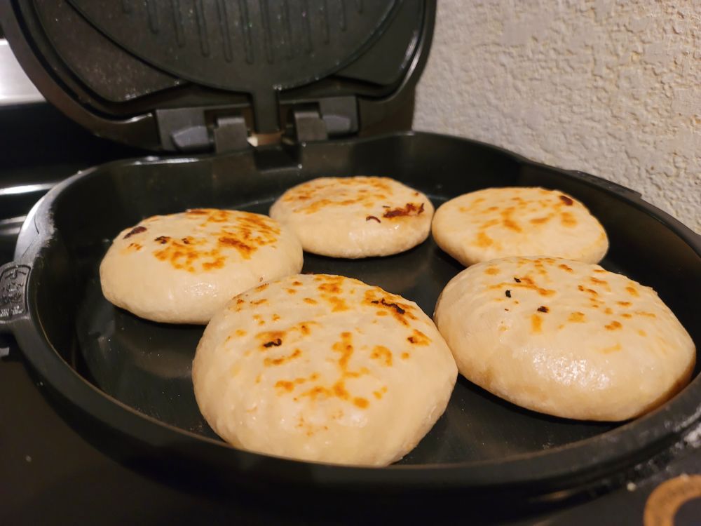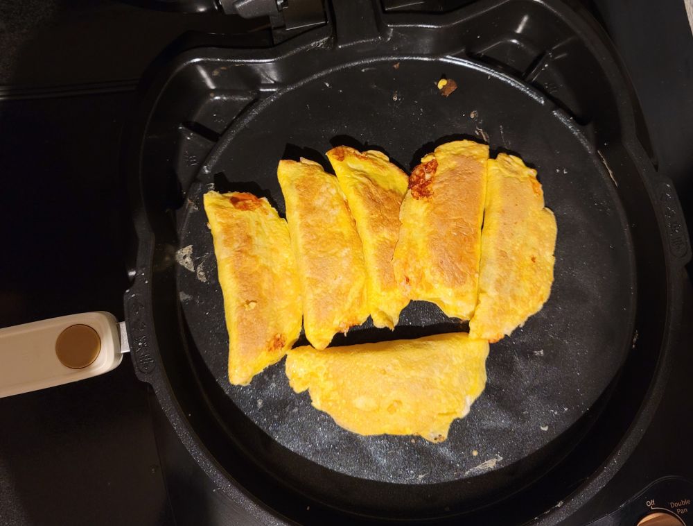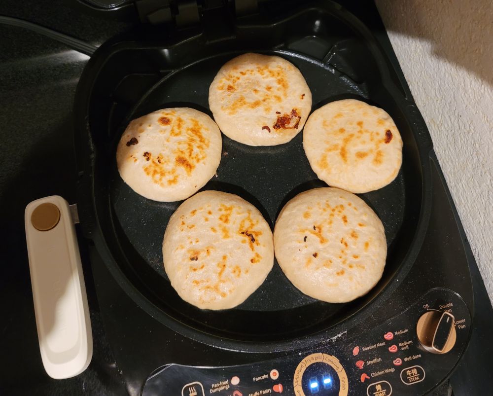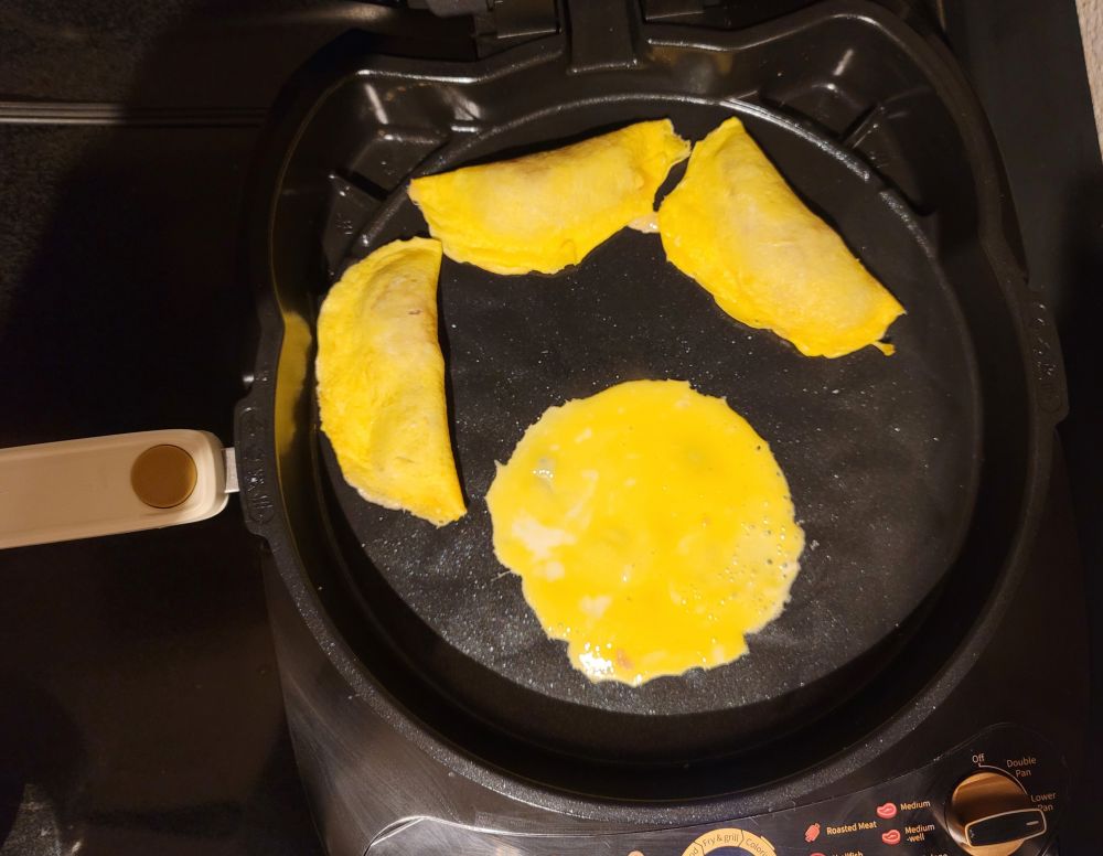 这个锅,你放蛋液不会流得哪儿都是,圆圆的非常好。放好肉馅合上就摆边上,不会粘不会糊,这个锅的特点。你做起来也不着急、不紧张。