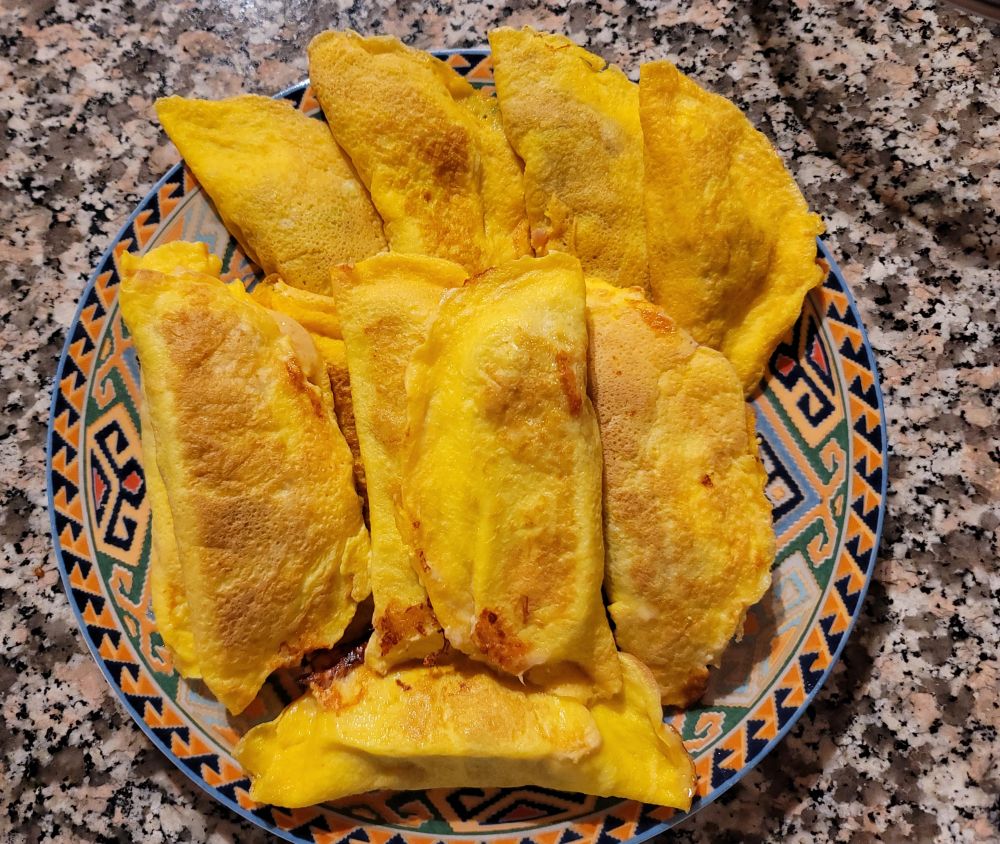 鸡蛋四个,加点淀粉水,这是网上学来的,少加一点点就行,估计为了鸡蛋更好粘合,我外婆做从来不加但做得特别好,一翻一个,一会儿就一盘子,技术活儿真不是谁都能做得好的。