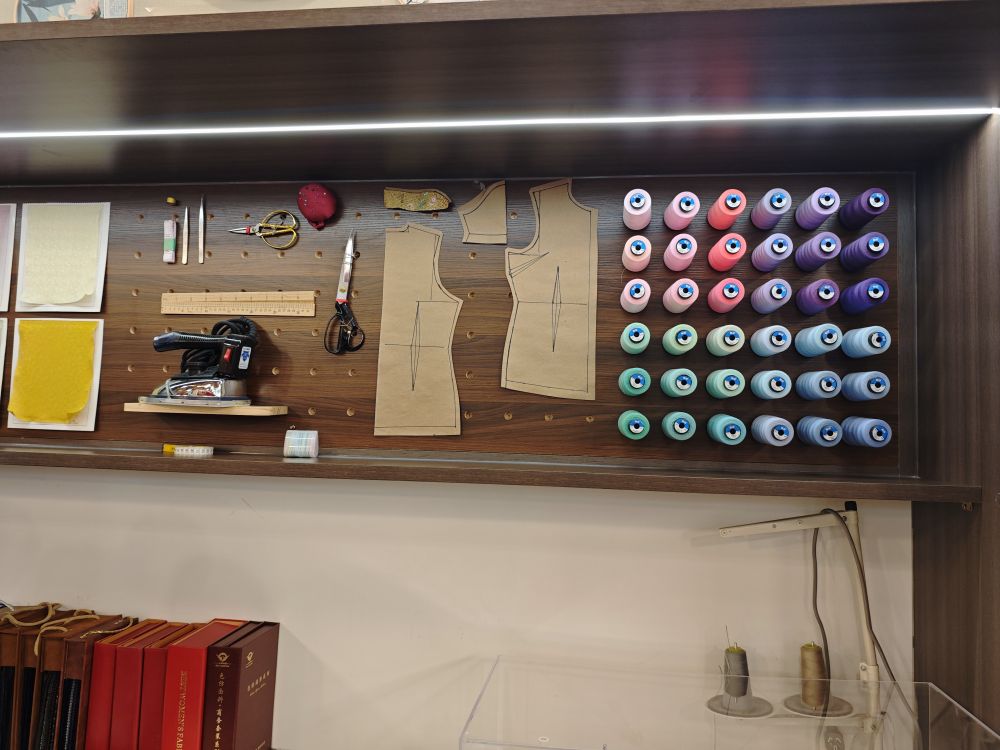 右手边,一卷卷绸缎整齐陈列着,灯光斜落,缎面泛起柔亮的光。左手边是成衣,有旗袍、坎肩等,穿在模特上,或静静悬挂着,每一件都透着一种“完成“的从容。