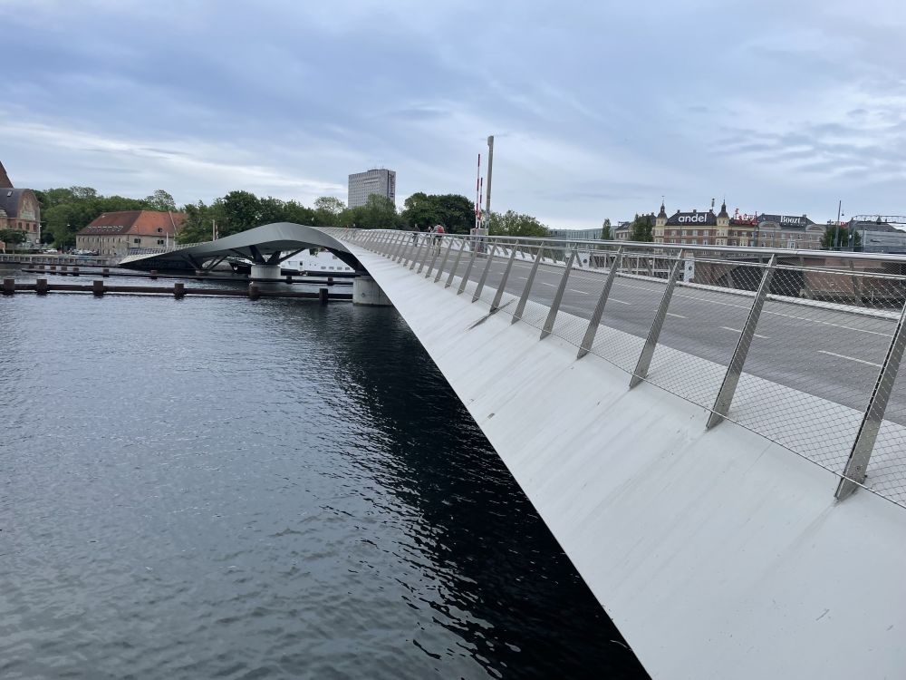利勒朗格布罗桥(Lille Langebro)。这是一座禁止机动车行驶的步行/骑行桥。桥面宽7米,3米供步行,4米供自行车骑者。大船来时,桥的中间部分可以旋转开启让船驶过。