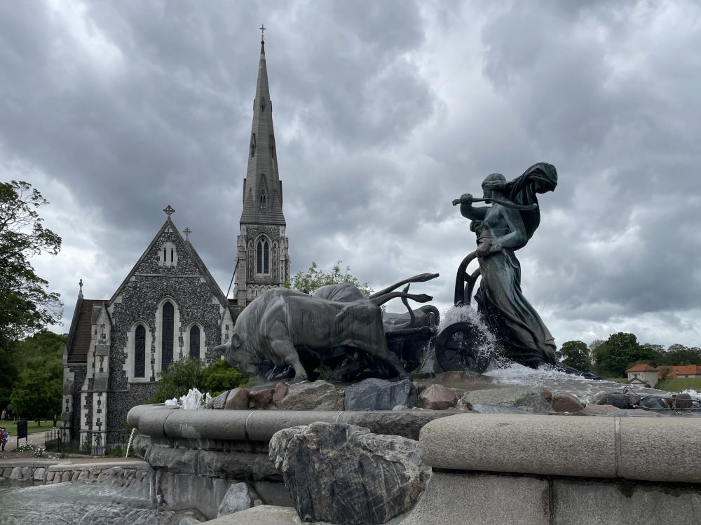 去看美人鱼的途中先看到1908年落成的“盖菲翁(Gefjun)喷泉”。喷泉上面是北欧女神盖菲翁驾驭着四头牛。