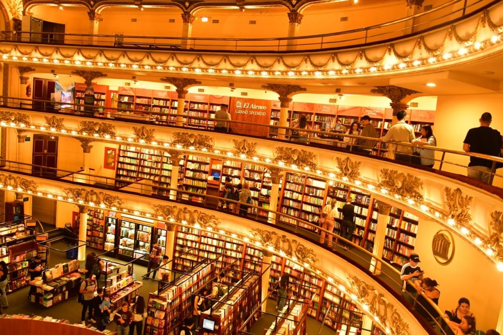 进入书店内部,穹顶上的巨幅壁画在俯视着潮涌般的读者,精美的包厢成了小型阅览室。宽阔的舞台曾是顶级探戈舞者激情旋转的地方,现在,是手拿咖啡杯,埋头阅览的读者。走廊,前厅,主厅原来的观众席上,到处布满了书架。书籍如山似海,这样的风景在当今世界上已经极为罕见了。