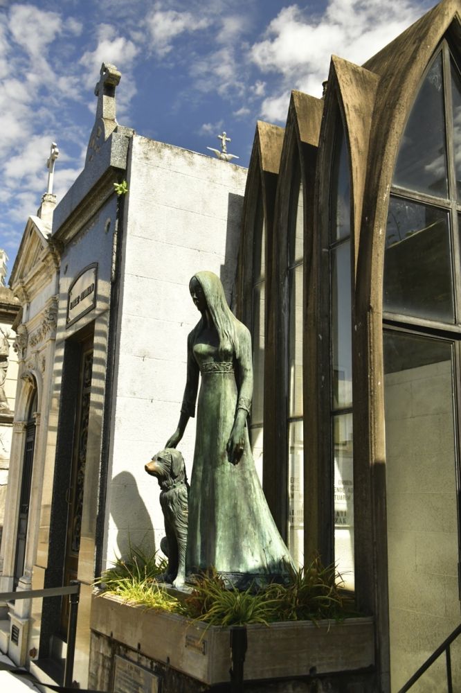 墓园中的墓室都由主人们自行设计、布局和装饰,大小不同、风格各异。很多的墓室配有精美的大理石或青铜雕塑。比较引人注目的是一位年轻漂亮女子牵着一只狗的青铜雕像。还有一个高高的墓室前一个卫士雕像,墓中主人生前应该是个高高在上的人物,死后还担心自己的安全,有点可笑。