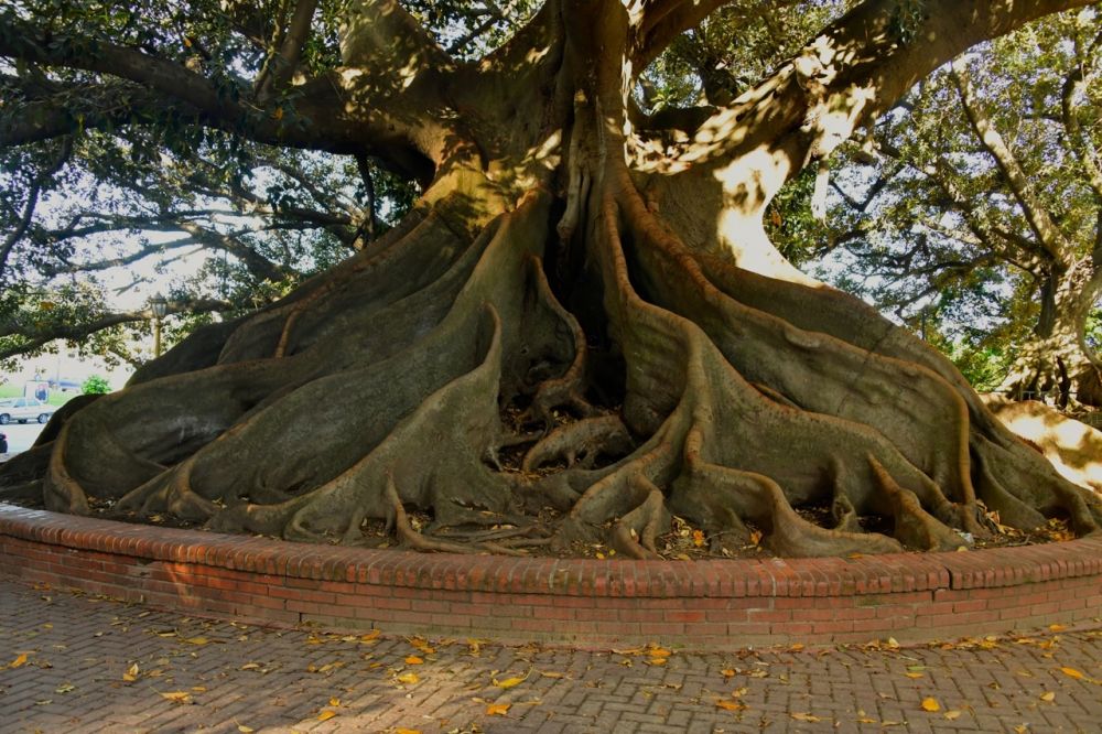 老城区能展示城市历史的除了老建筑,还有老树。之前看网上介绍,一棵著名的历史巨树因为太大,雕塑家做出一个巨人雕塑扛起了就要垂下的主要枝干,成为布市一景。我没有特意去找这棵树,只是在雷克莱特区邂逅了一棵种于一七九一年的老榕树,树根处被精心的圈了起来,枝干,树根都很遒劲,一圈一圈,写满了二百多年的沧桑。