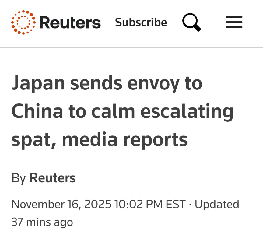 路透社最新消息,为了平息高市早苗涉台言论所造成的迅速升高的日中紧张关系,日本政府决定于11月17日,周一,派一名高级外交官作为特使前往北京,以图缓解日渐失控日中外交危机。日本外交官的名字是MasaakiKanai,thedirectoroftheJapaneseforeignministry'sAsiaandOce...[