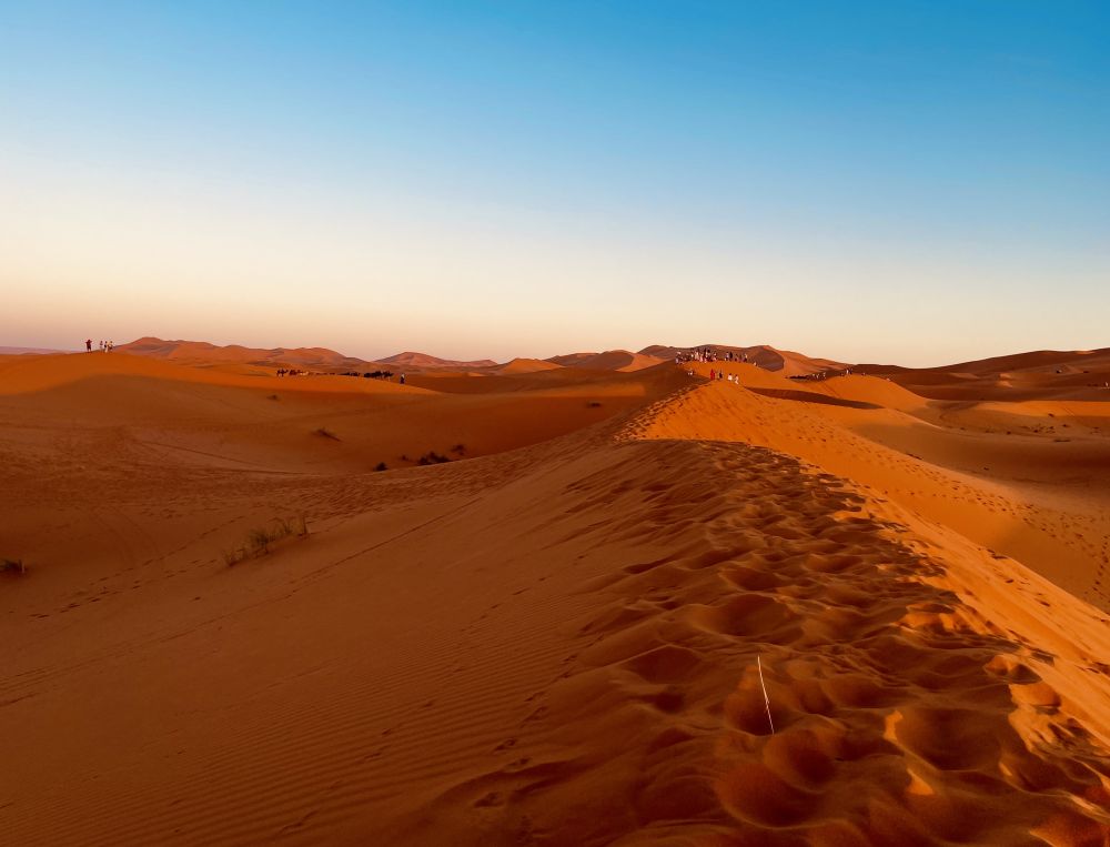 沙漠之梦——撒哈拉的夕阳第二天下午,我们换乘越野车前往梅尔祖卡(Merzouga),那是进入撒哈拉的起点。车子在广阔的荒原上疾驰,地平线被拉得无限遥远,天地之间仿佛只剩下风声与尘土。远远望去,金黄色的沙丘如海浪般层层起伏,我们终于到了传说中的埃尔格·谢比沙丘(ErgChebbi)——摩洛哥最著名的撒哈拉景观之一。导游告诉我们在电影中看到的红[