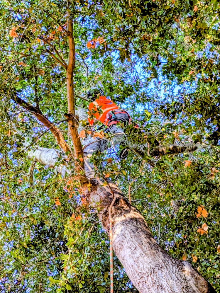 隔壁有几棵上了岁数的加州海岸大橡树,高达几十米。有些树枝离我们的屋顶太近了,危及房顶的安全。