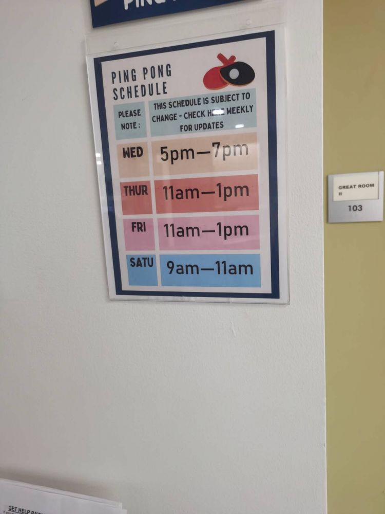 其实,我每星期还有固定的schedule,要去这里的Seniorcenter,陪球友打乒乓球。我原则上是每周去一次,每次打一小时,但若有球友相邀,还会临时增加次数和时间,只要没与我英语课时间冲突,我都是有邀必到。