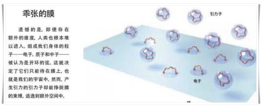 而如果十一维确实存在,通过方程式计算出来后,它们看起来就像薄膜或面,它使单根弦延伸成了薄膜,膜可以是三维也可以是更多维的,给它足够的能量它可以变得和宇宙一样巨大。巨大薄膜与额外维度的推论存在,会得出一个令人惊奇的结论,那就是我们的宇宙存在于一个更大更高维空间的薄膜上。