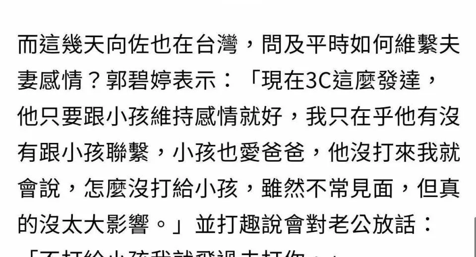 两人确实不天天住在一个屋檐下,但郭碧婷有自己的规矩。 她对向佐说:“你可以不跟我打电话,但必须每天跟孩子视频。