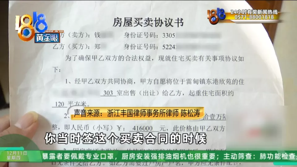 陈松涛:你当时签这个买卖合同的时候,这个房子实际上是三个人共有的嘛。所以对于郑大姐来说,买房子的时候,如果要保证以后能过户,那应该要这三个人都要签字,你不能只跟一个钱先生一个人签了字。