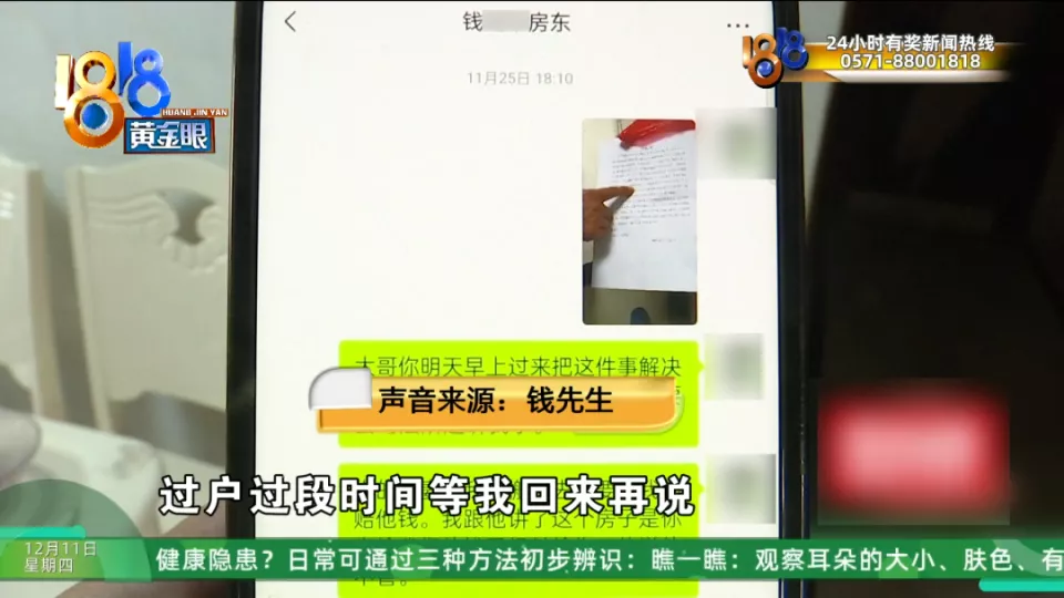 郑大姐:估计是十几天前,他的前妻就找上门来了,就要向我收房,她说“我是房东”,这房子是我女儿的,你们搬出去,就这样的。就来我们家大吵大闹的,估计闹了个十几分钟,然后第二天又继续来了,给我发了一张告知书来,叫我搬出去,还要我付她9年的房租18万,还要起诉我什么坐牢什么的事情。